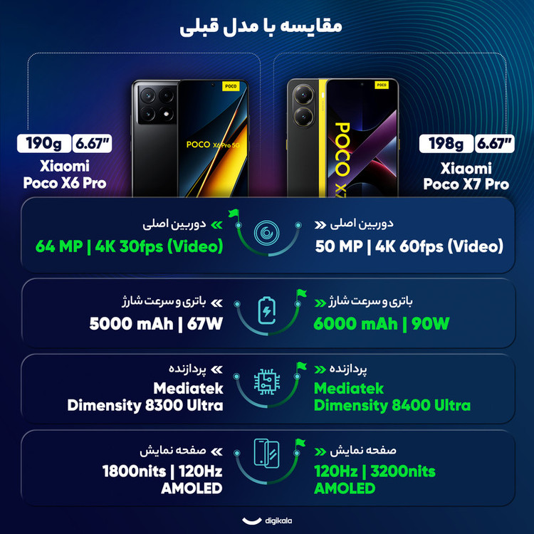 گوشی موبایل شیائومی Poco X7 Pro نمونهای از نوآوری در کلاس میانرده بهشمار میآید که با تلفیق طراحی شیک و عملکرد بالا، تجربه کاربری رضایتبخشی ارائه میدهد. این گوشی با ابعاد مناسب و وزنی حدود 195 تا 198 گرم، ترکیبی از دوام و راحتی در دست را به کاربران عرضه میکند. پوشش جلویی از شیشه Gorilla Glass 7i به همراه قابهای پشتی مختلف از جنس پلاستیک یا سیلیکون با روکش چرمی، ظاهری مدرن و مقاوم در برابر ضربه ایجاد کرده است. همچنین استانداردهای IP68/IP69 از نفوذ گرد و غبار و آب در شرایط سخت محافظت میکنند. صفحه نمایش 6.67 اینچی AMOLED با رزولوشن 1220×2712 پیکسل و نرخ نوسازی 120 هرتز، تجربه بصری بینظیری با رنگهای زنده و جزئیات دقیق ارائه میدهد. فناوری Dolby Vision و HDR10+ همراه با نوردهی بالا تا 3200 نیت، بهرهوری بیشتر در محیطهای روشن را تضمین میکند. از لحاظ عملکرد، Poco X7 Pro از چیپست قدرتمند Mediatek Dimensity 8400 Ultra با ساختار ۴ نانومتری و پردازنده هشت هستهای بهره میبرد که عملکرد روان در اجرای بازیها و برنامههای چندوظیفهای را فراهم میکند. اما ستارهی اصلی این گوشی، باتری 6000 میلیآمپرساعتی با شارژ سریع 90 وات است که در حدود 42 دقیقه از صفر تا صد درصد شارژ را ممکن میسازد. در مجموع Poco X7 Pro ترکیبی از تکنولوژی روز، قدرت عملکرد و ظرافت طراحی است که پاسخگوی نیازهای کاربران پرتوقع محسوب میشود.
